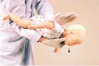 兒的胸部能起伏,說明沒有異物梗塞,采取胸外拇指按壓復蘇法處理。若模擬患兒的胸部不能起伏,判定為模擬患病嬰兒為氣道異物梗塞,采取如下救治操作程序進行:1、首先將梗塞異物(黑色海綿塊)放入口腔內咽喉處,模擬嬰兒氣道梗塞現場。2、接著,將模擬嬰兒騎跨在一側前臂上, 同時手掌將后頭頸部固定,用另一手固定模擬嬰兒下頜角,并使模擬嬰兒頭部輕度后仰,打開氣道。3、兩手的前臂將嬰兒,翻轉呈俯臥位;用手掌根叩擊模擬嬰兒背部肩胛4次,檢查口腔,如異物(黑色海綿塊)咯出,迅速采取手取異物處理。4、用另一種方法,兩手前臂將模擬嬰兒氣道阻塞及CPR模型固定,翻轉為仰臥位,快速沖動性按壓模擬嬰兒兩乳頭連線下一拇指處4次,檢查口腔,如異物(黑色海綿塊)咯出,迅速采取手取異物法處理。