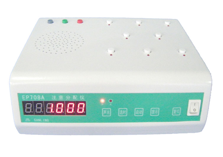 產品概述: 注意分配亦稱時間分配。即在同一時間內把注意分配到不同對象上。注意分配的條件是:①要有熟練的技能技巧。②是有賴于同時進行幾種活動之間的關系。 注意分配儀就是按以上原理,用於檢驗被試者同時進行兩項工作的能力?捎糜谘芯縿幼鳎瑢W習的進程和疲勞狀況。該儀器可分別結合隨機呈現聲、光二種刺激,根據被試者的判斷、應答、所用的時間及正確次數,作為測試的結果。 結構與原理: 該機是以 89C51 單片機為核心,結合數碼顯示、功能鍵盤、操作面板組成。 1. 操作面板設有光信號輸出 8 路,對應 8 反應鍵,聲信號輸出三種(高、中、低)對應 3 路反應鍵。 2. 面板上有 6 位數碼顯示,可顯示正確總時間、正確次數、正確平均時間、在功能設置上可顯示聲、光或聲+光狀況,刺激呈現次數。并設置有 聲 / 光刺激選擇按鍵,次數選擇按鍵、啟動鍵結果顯示鍵,以及復位鍵。 3. 控板是以單片機為主體帶有數據存貯、功能轉換、數據運算、統計及控制等能力。在主試選擇刺激呈現的形式、數量以后,隨機呈現選用的刺激,待被試根據分配能力作以反應,后統計完成設定數量所用的時間、正確數及其平均時間。