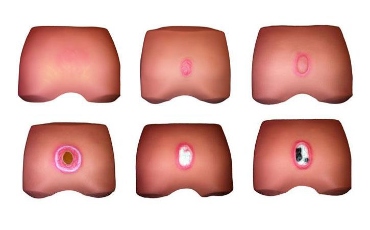 ● 模型具有六張臀部外皮,分別顯示壓瘡的動態變化,包含淤血紅潤期、炎癥浸潤期、淺度潰瘍期、壞死潰瘍期等不同階段