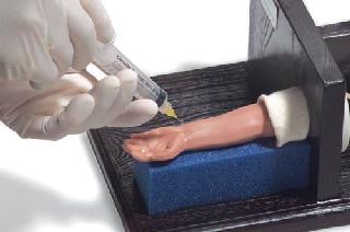 Lifelike reproduction of an infant arm with bony structure allows students to master the technique of neonatal radial artery puncture.